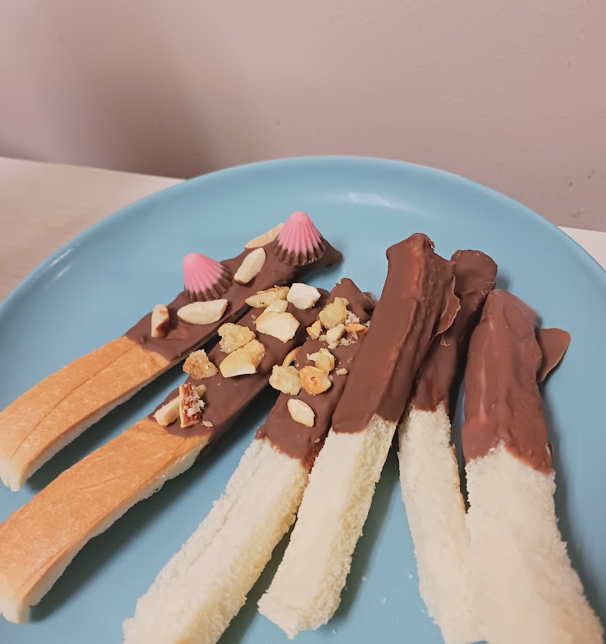 これをトースターでカリッとするまで焼いたら、溶かしたチョコをつけるだけ✨🍫